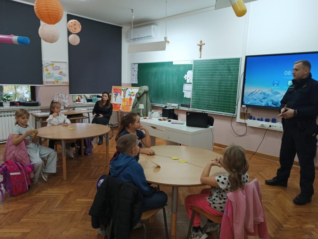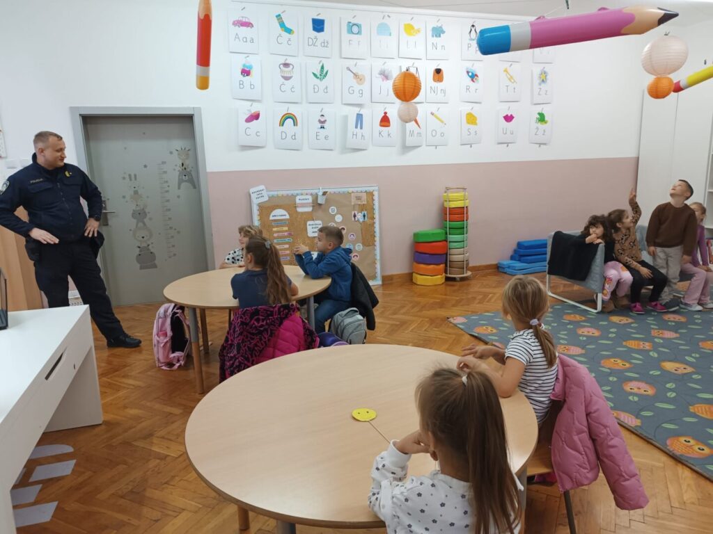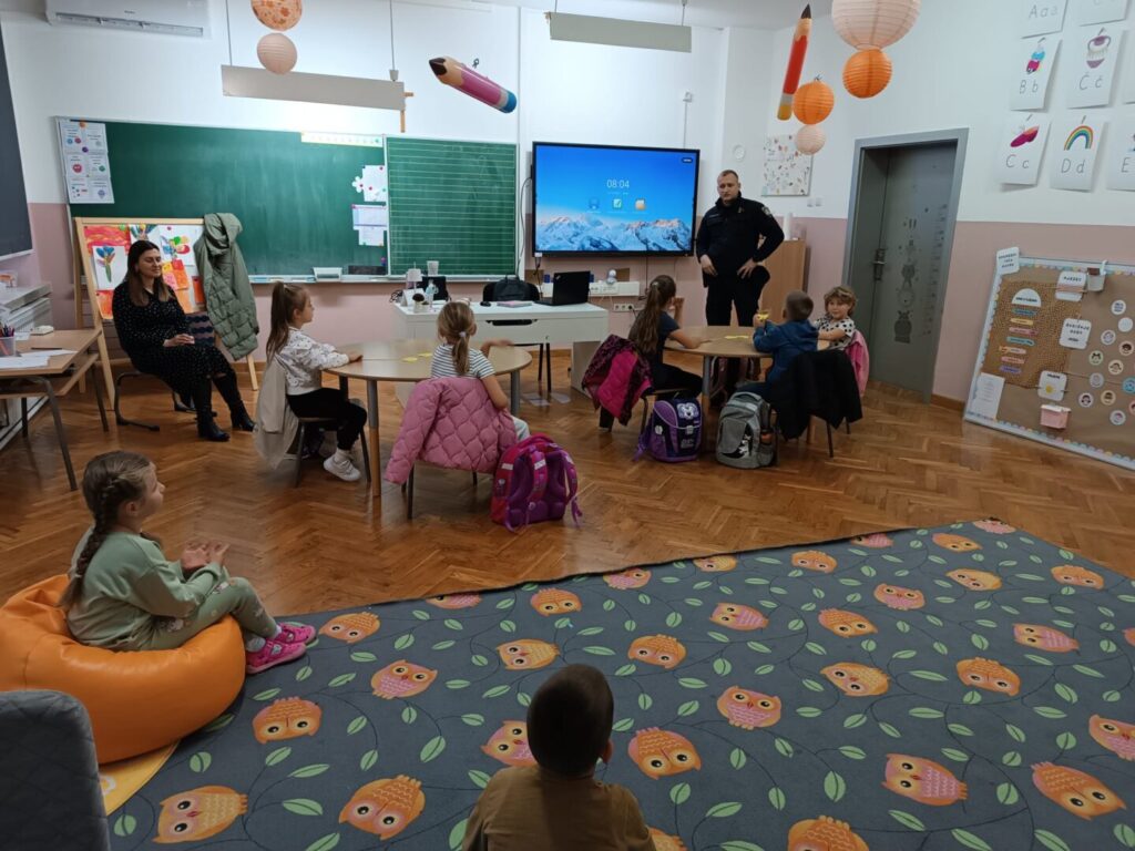 Učenici predškole i 1. razreda s velikim su zanimanjem sudjelovali u edukativnom susretu te naučili kako sigurno sudjelovati u prometu – kako pravilno prelaziti cestu, što znače prometni znakovi i zašto je važno nositi reflektirajuće oznake.